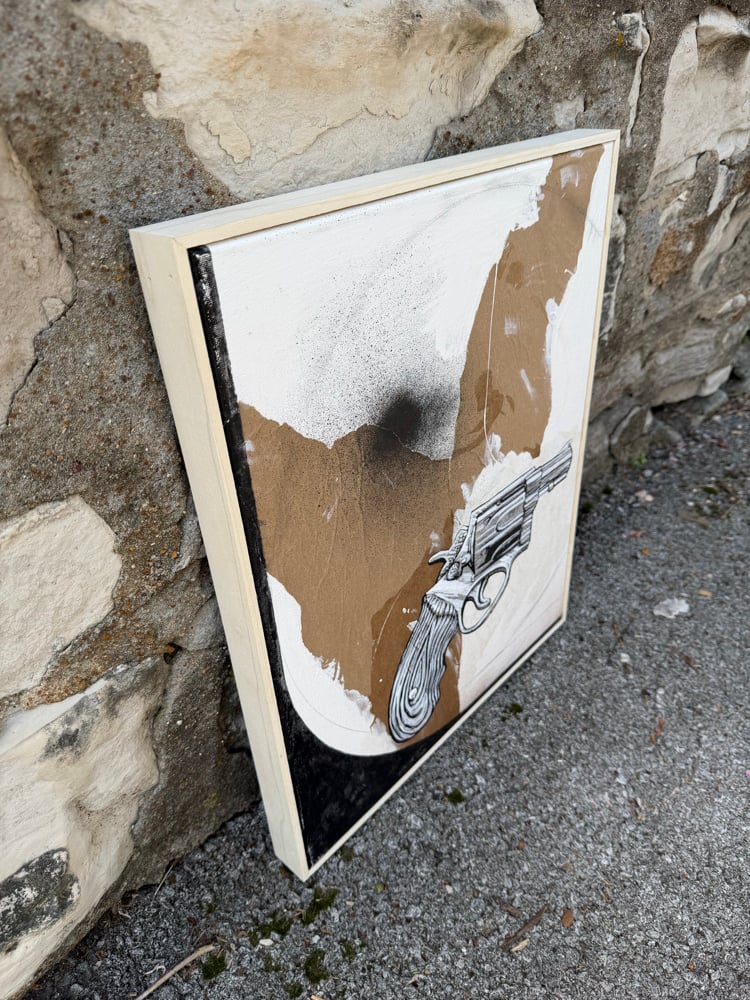 Acrylic, enamel, and, collage on canvas